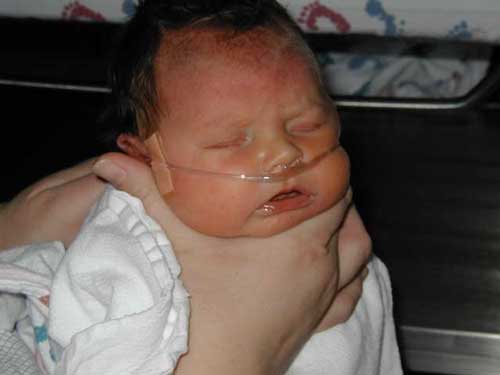Labor went rather easily, compared with others we had heard of. Then the big moment: at 1:00 p.m. Wednesday Elizabeth started pushing. After 2 hours, we find out that the cord had become wrapped around Taylor's neck. She got stuck for a few minutes in the birthing canal, and Taylor was unable to breathe for an unknown number of minutes. When we were able to get her out, she was not breathing, and was rushed to the nursery for emergency care, and an hour later was rushed to Huntsville East Hospital to their NICU.