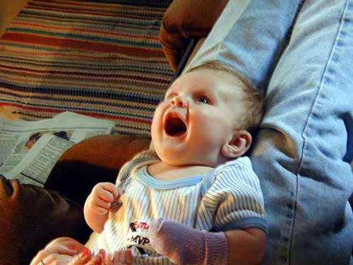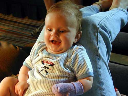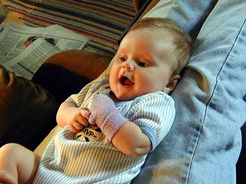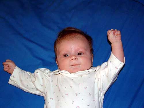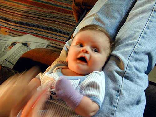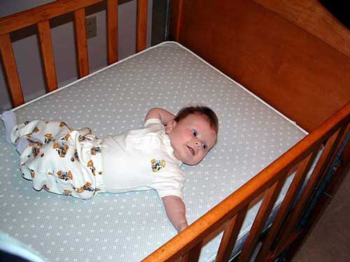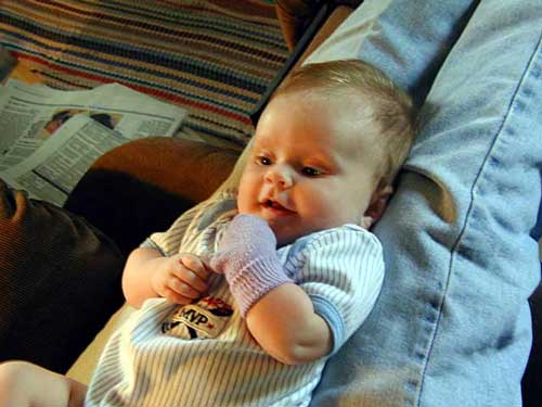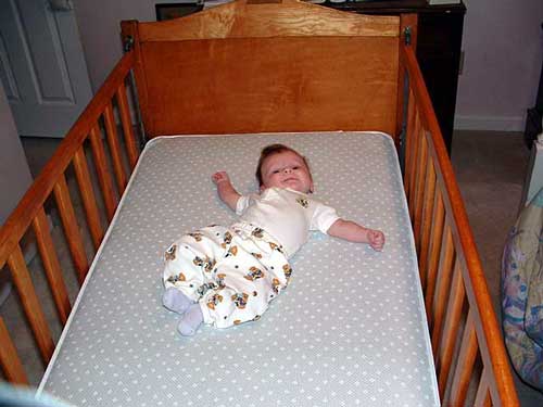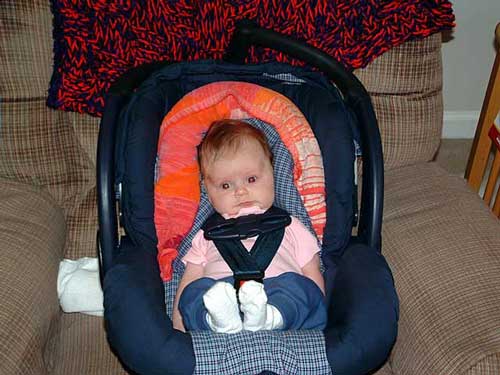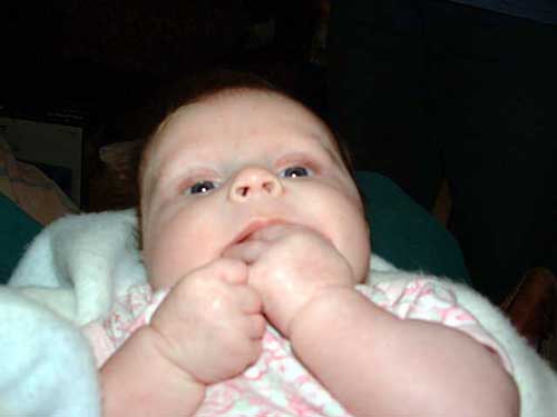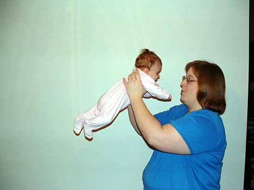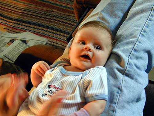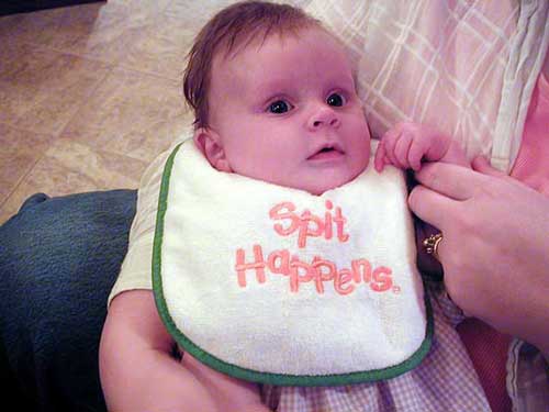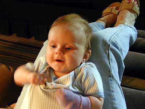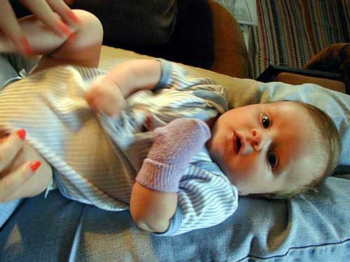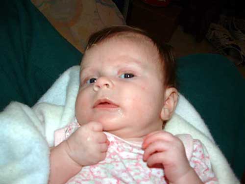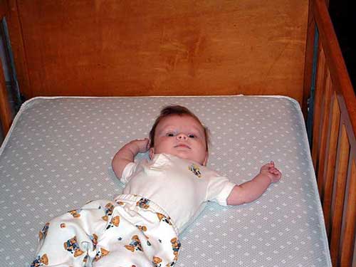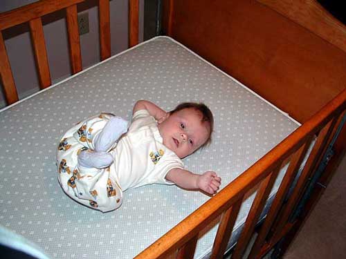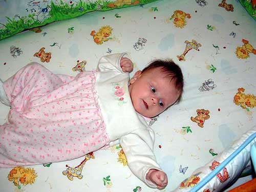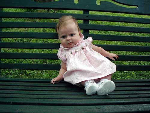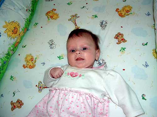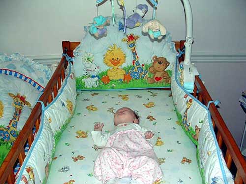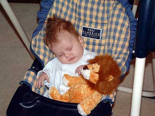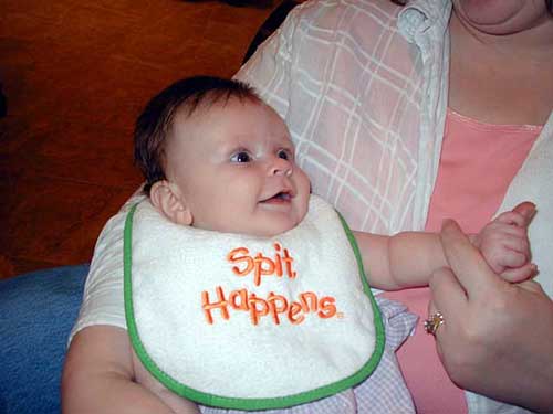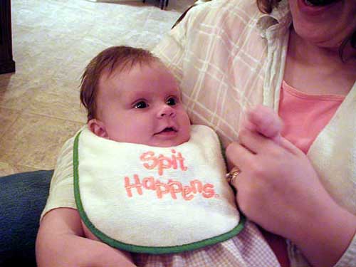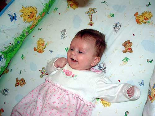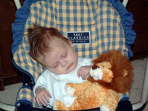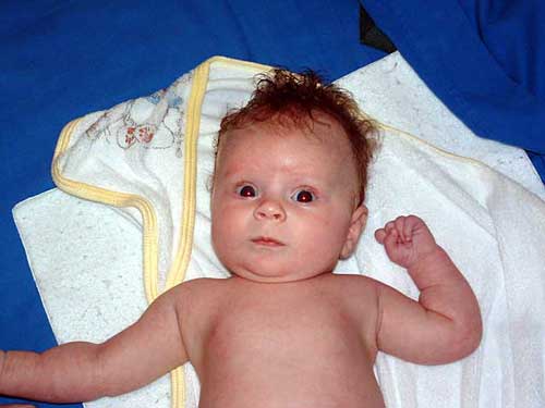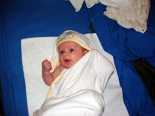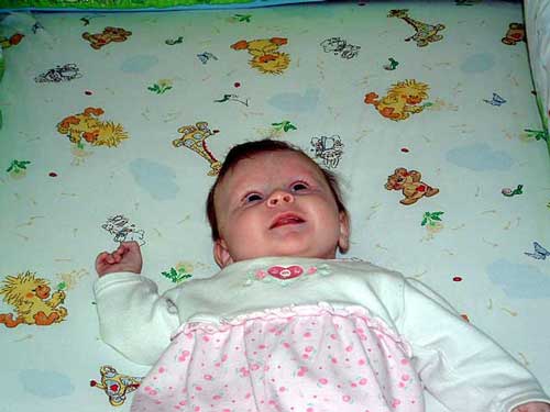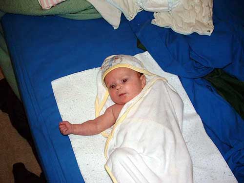 Bath time! See, we said she had Daddy's hair. Also this week: Taylor moves into her new crib (3rd generation of babies to sleep in this crib) and playing with her lion in her swing.