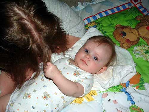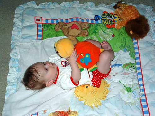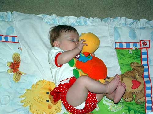 She rolled over from belly to back in May and we were wondering how we were going to get her to even want to roll to her belly considering she doesn't like being on her stomach. The best we can guess, she was trying to see something that was behind her and she rolled to her side then to her belly, lifted her head and, voila, she could see what she wanted to see! Okay, so she was trying to see the TV.....*sigh* But she rolled over!!!! :)