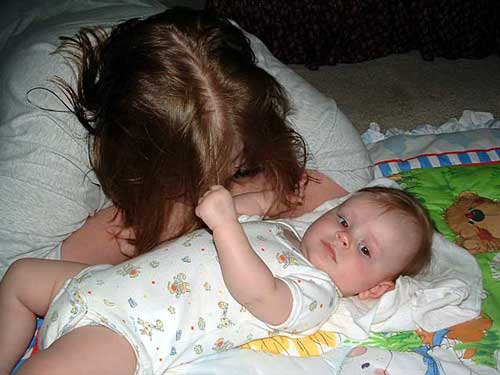 I forgot to mention some other stuff. Getting ready for church, we decided it'd be more fun to play with Taylor. Brian was on the floor with her and she was feeling his face and beard and I joined him. She found my hair and had two fistsful - Brian got a picture and as soon as Brian shows me how, I'll post it. Update: pictures are below Needless to say, we were late to church.