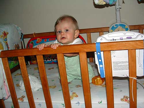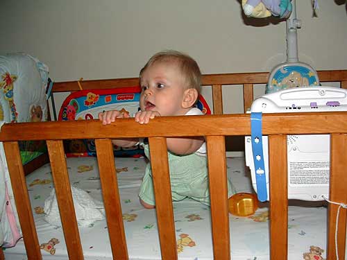 Sorry it's been so long since the last update. We're settling into our new home. Taylor has adjusted quite nicely. We got a little worried when, after a few late night bottles, she woke up twice the first night she didn't get that late night bottle. False alarm, she started sleeping through the night again after that. Here's a few pictures of her in her crib - this is the 3rd generation to teeth on it. :) One more side note: We lowered the mattress when we set it back up. It looks like we'll need to lower it again soon. She's started trying to pull up on it.