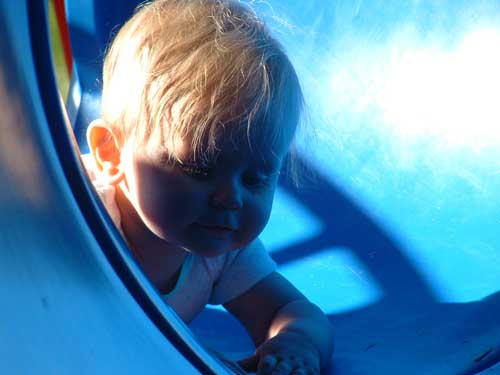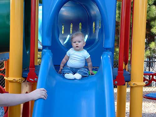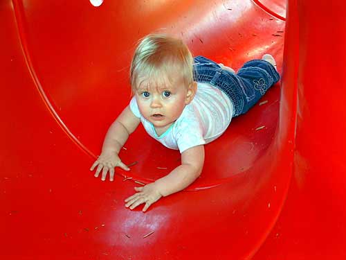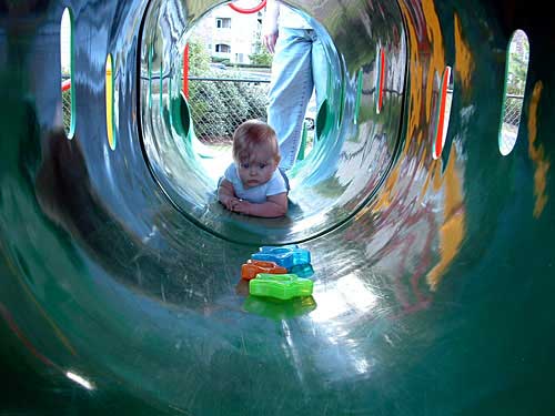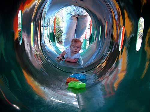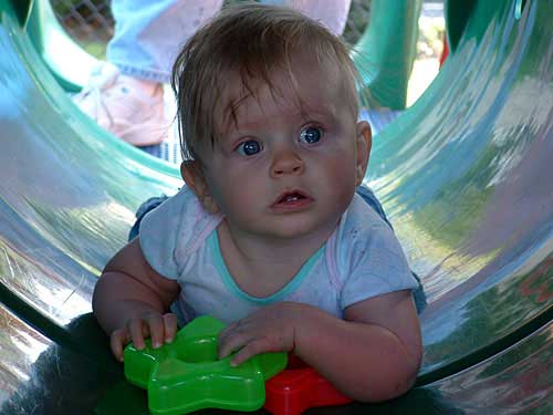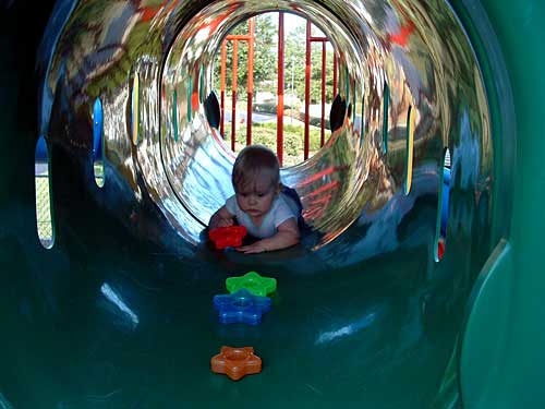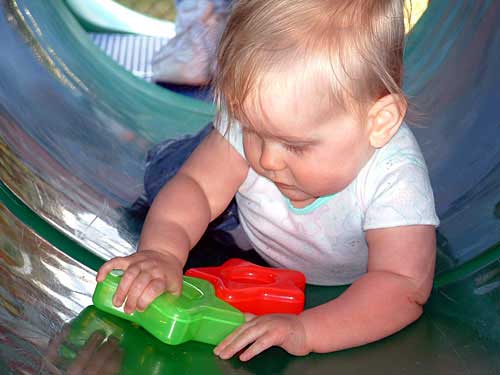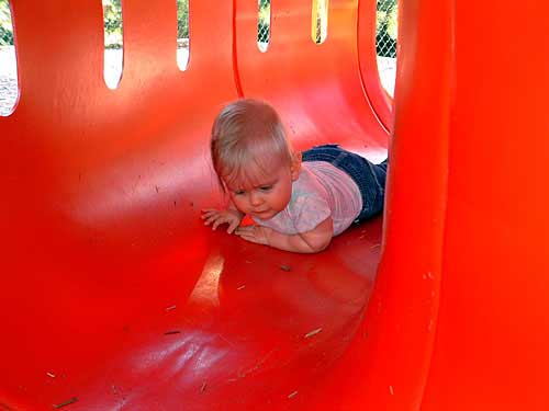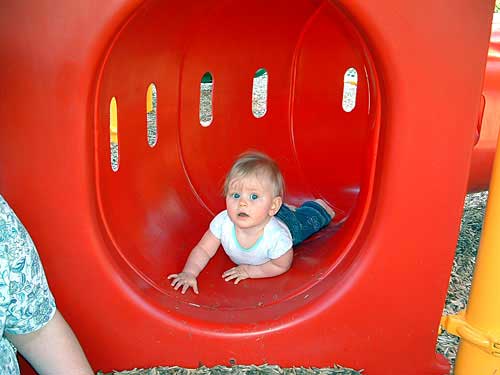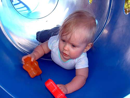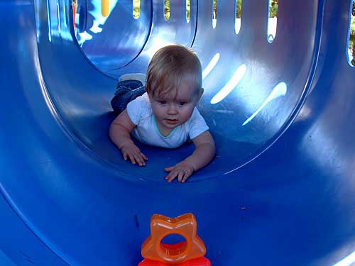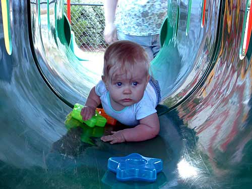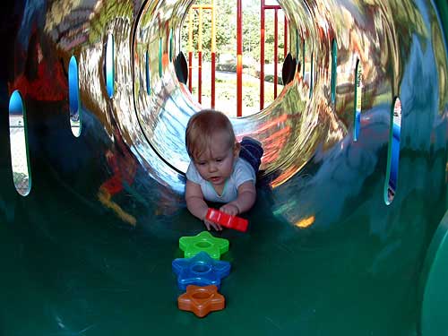 Weekend before last the weather was so nice, we decided to pack Taylor and the camera up and head to the apartment playground. We had an absolute blast watching her. We took along some of her favorite stacking stars to encourage her to crawl through the tunnels.
