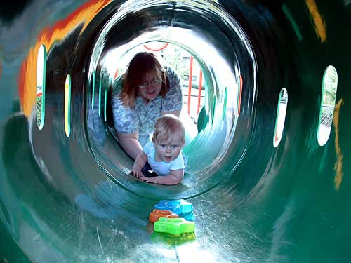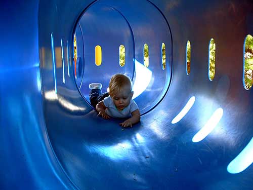 The blue and red tunnels were flat, and she had no problem navigating around the bends to one of us waiting on the other end. The green tunnel was on about a bit of an angle, and with her lack of traction, she struggled with that climb.