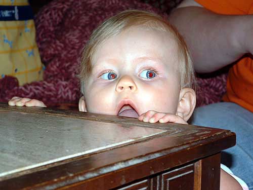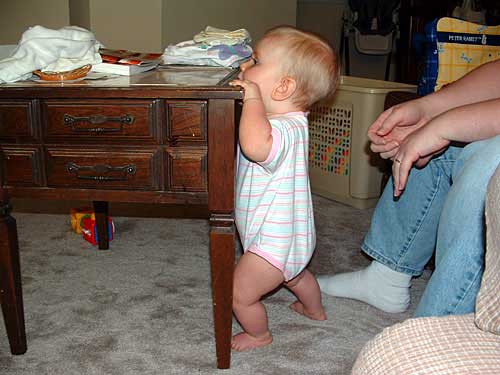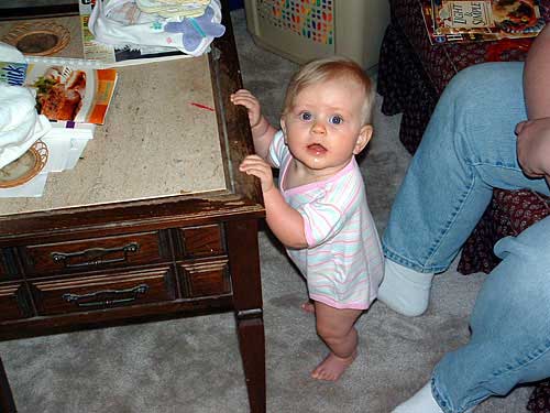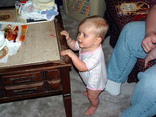 Oh! Normal kid stuff - she's pulling up on everything she can get her hands on! And, she's started to cruise. The furniture doesn't flow well in the living room so she often cruises along our leg to get to another piece of furniture. :) As a result of her pulling up on practically everything, she also has her first bruise. A small wooden end table fell and she has a very VERY small bump on her forehead. Mommy & baby were fine after getting over the initial scare.