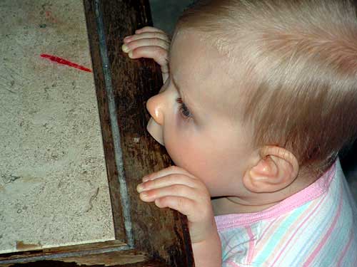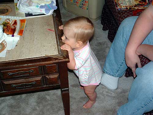 We have set up a sort of blockade of stuff to keep her in one area in the living room. We discovered this past weekend that the blockade will not last much longer. One of the items is about 6.5" tall and, as of yesterday, she can now climb over it. She pulled up on it and was standing and looked like she was going to try to move over to the box next to it (another 6" higher). Then, she did move to the box (we put something on the box to try to entice her :) ). So! We are now seeing the beginnings of cruising and have mixed emotions of fear and happiness. :)