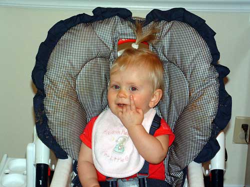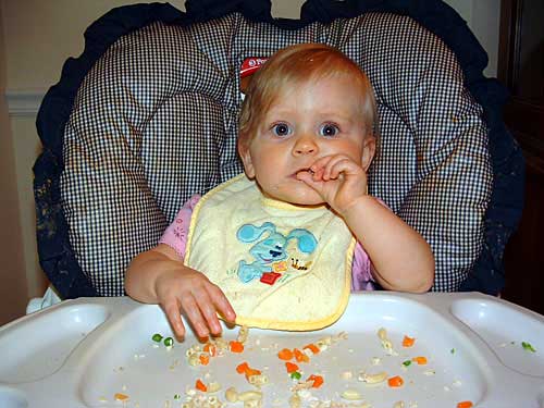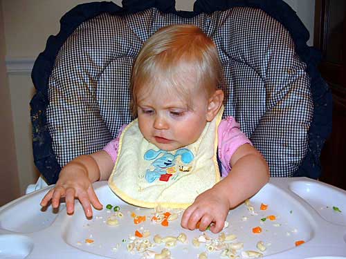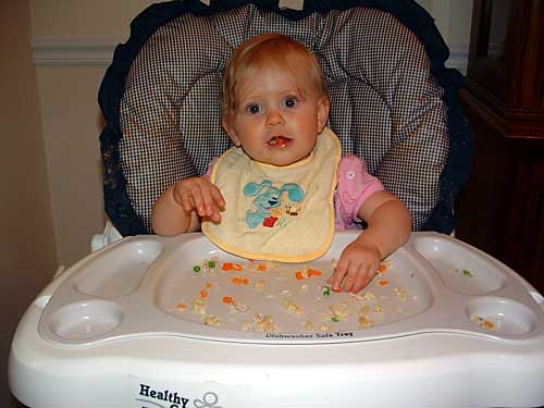 I realized today that there is a downside to her feeding herself table food. Besides the mess and how long it takes her to eat...those, I can live with. Well, I'm learning to live with how long it takes her to eat. Today, I tried to feed her lunch. It was a Gerber or Heinz level 3 food and some applesauce and I really wanted us to get to the zoo so I was in a hurry. She accepted a few bites of each then refused everything and tried to get the spoon and/or bowl from me. I gave up on getting to the zoo by 1 (we got there about 2:30). I had cooked up some chicken and broken it into pieces yesterday. I quickly nuked some along with some peas and she was quite content...unless I let her tray get empty. Oh yeah, I kept the bowl and spoon.