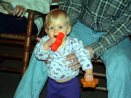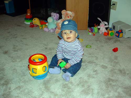 She had her first playdate this past Wednesday. A little boy named Riley. Brian & Riley's dad went to college together and they live near B'ham so we got together. We learned that Rylee & Taylor have a toy in common - a little star stacker thing that plays music when you push the top. We enjoyed a night of watching them fight, so to speak, over the stars. They also both enjoyed the activity table we have and, with their combined weight, they managed to push it across the room and then some. It was a lot of fun and we look forward to more playdates.