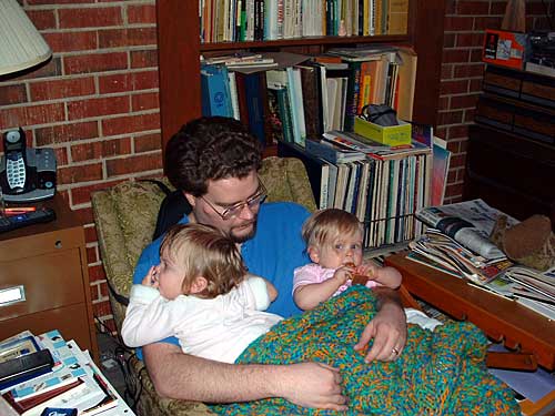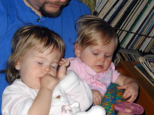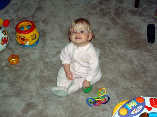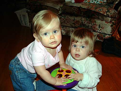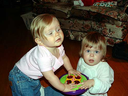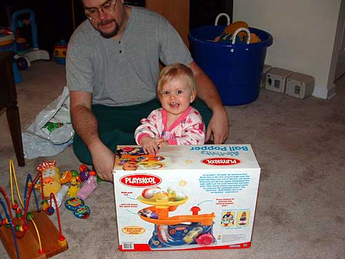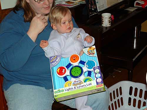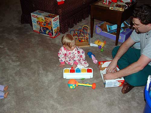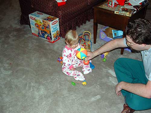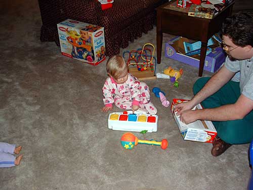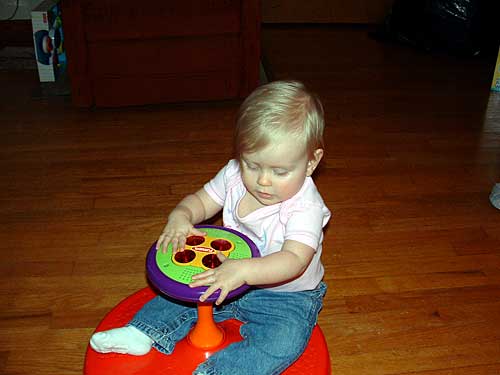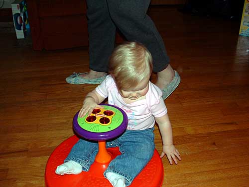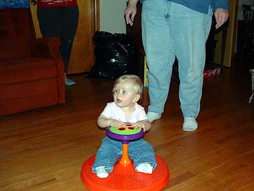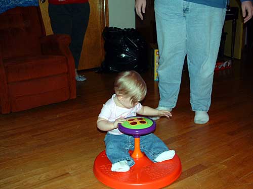 We'll start off with Christmas morning itself. Uncle Mike, Aunt Bev and 3 cousins (Abby, Amy and Ariel) stayed over as well, so we had 10 sleeping in one house. It was a little crowded, but a lot of fun. Here are pictures of Taylor playing with a new present, sharing Ariel's Sit-n-Spin, and spending some quality time with Ariel in Daddy's lap.