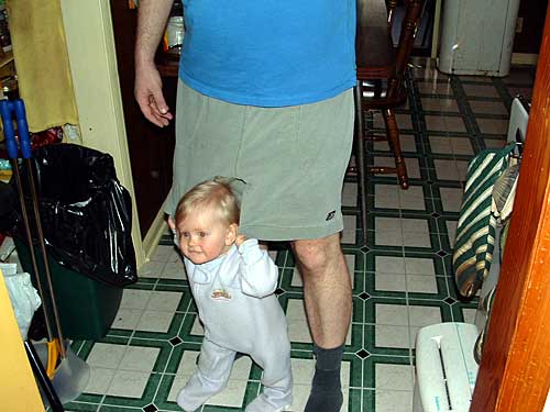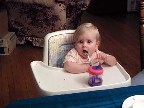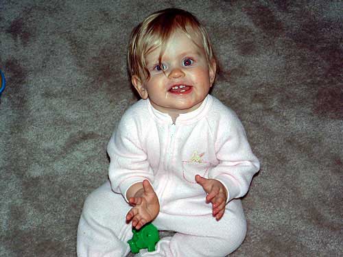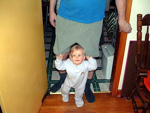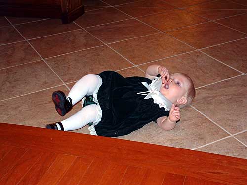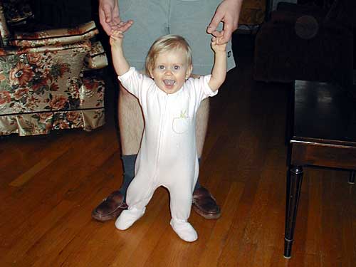 A few pictures from Taylor's latest visit with the grandparents in Huntsville. Thanks to Aunt Kerin's work over Thanksgiving weekend, Taylor is mastering the art of finger walking. want to cuddle with her? Nope. She'll wriggle out of your hands and slide off the end of the chair, grab one of your fingers in each of her hands, and you're off! Lately, her favorite place to walk is from the refrigerator about 10 feet to the dining room, then back to the refrigerator, then back to the dining room, then back to the ... you get the point.