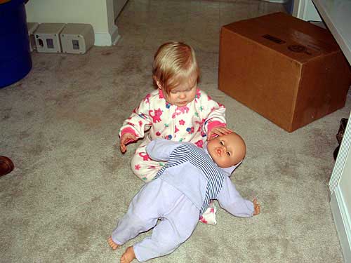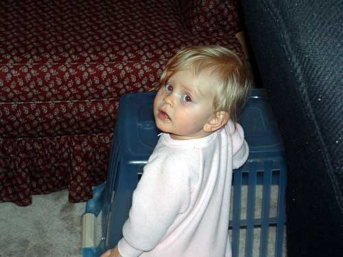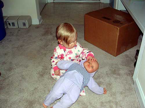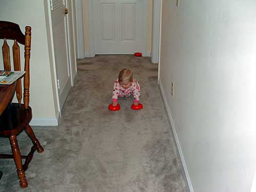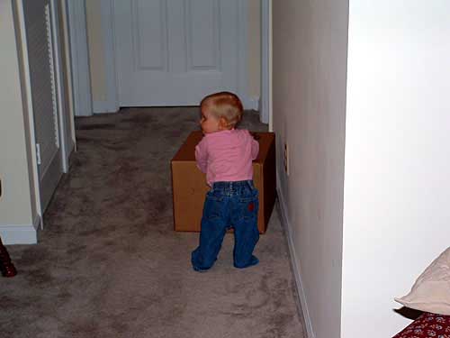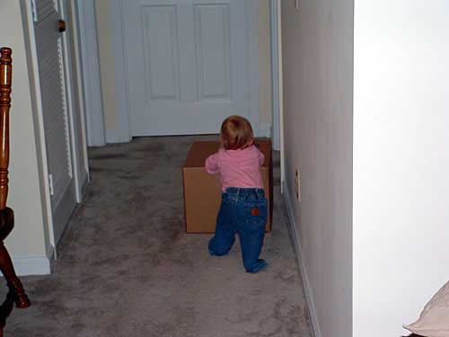A couple quick hits: Taylor pushing an empty box down the hall ("Christmas presents? Nope, the best toys this year are the big boxes!"), playing with the door to the bedroom ("Mean ol' Mommy and Daddy keeping me out of trouble") and figuring out how to open kitchen cabinets ("Umm, Daddy, shouldn't these have safety locks now?")