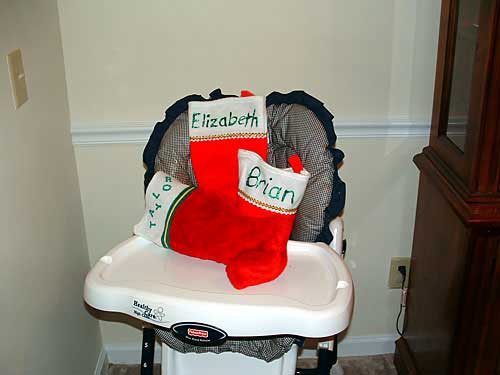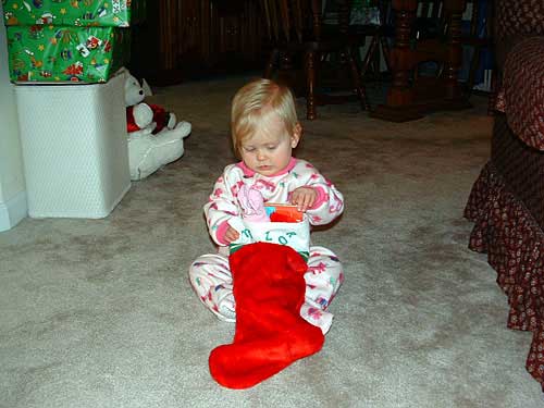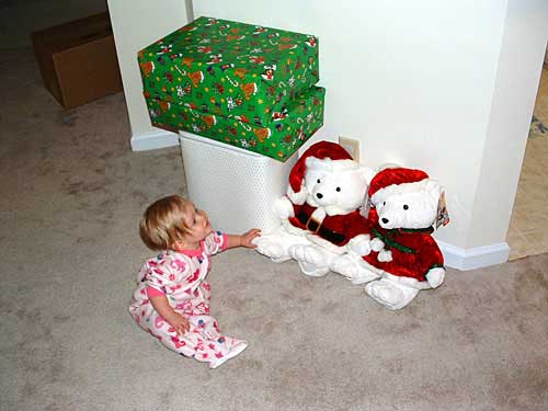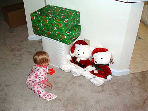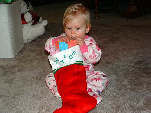 The pictures include shots of our stockings and tree (the ultimate in baby-proofed Christmas decoration arrangements), Taylor and Elizabeth's Christmas bears (a Gohman family tradition) and Taylor unwrapping and playing with some of her new toys, including the wheels from a Walk-n-Ride before Brian had a chance to assemble it.
