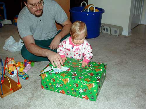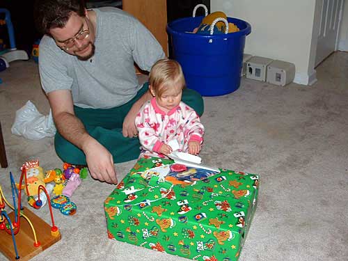 It's Taylor's first Christmas morning, at least the day we're celebrating it at home. We'll be spending the weekend with Brian's family in Huntsville, and of course we'll have plenty of pictures. Taylor got the hang of unwrapping presents pretty quickly, though the boxes and wrapping paper often proved more alluring than the new toys.