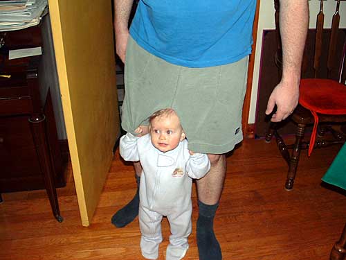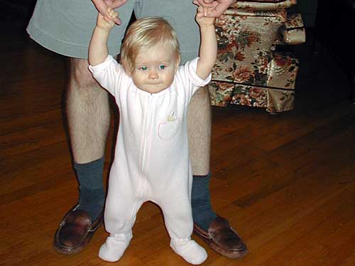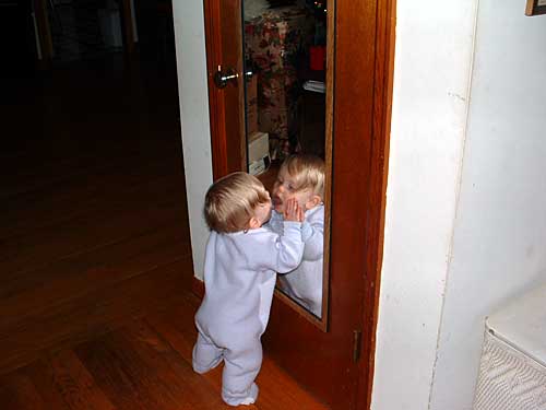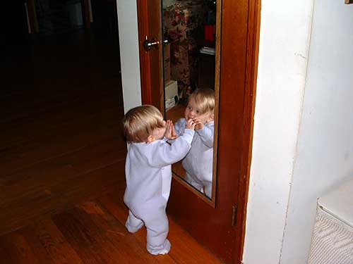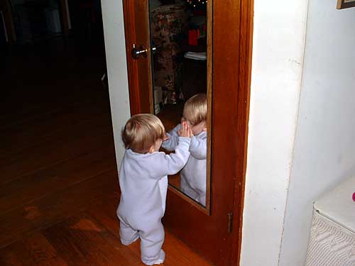 December 26: Taylor gets in a little walking practice, courtesy of Daddy's shorts, and playing with her new best friend in the mirror.
