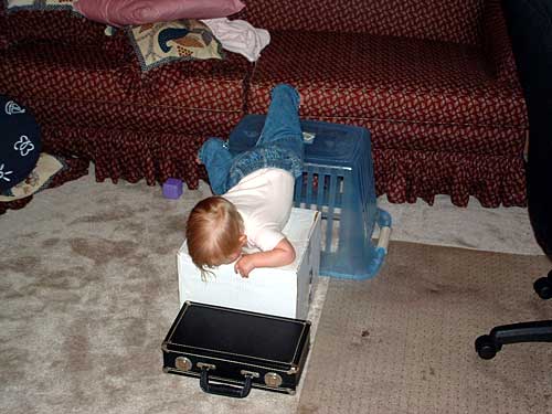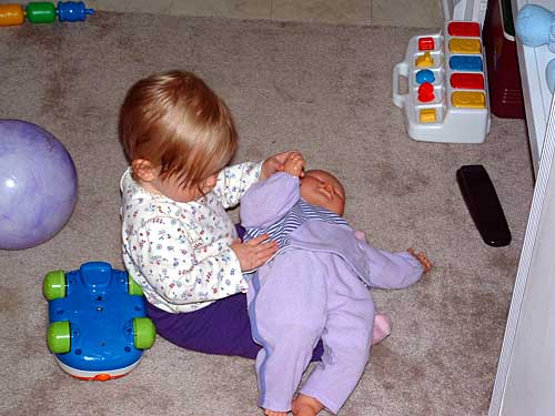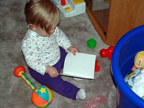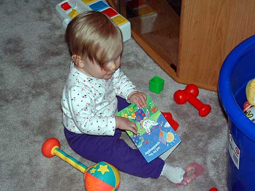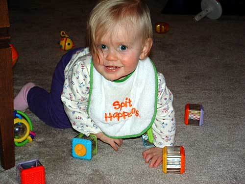 Taylor has bunches and bunches of blocks now and is finally showing interest in stacking and arranging them. Last night, Brian put some on a coffee table that we let her have access to. While he was watching, she picked each one up and dropped it on the floor. He went into the kitchen to put away dishes and when he came back out, she was dropping them on the floor again. In other words, while he was away, she put them back on the table and then started dropping them again.