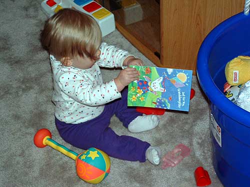 She shakes her head when we tell her no but doesn't always stop what we're trying to get her to stop doing. She waves bye bye more consistently now...even to the Teletubbies. She holds her play phone up to her ear (sometimes her toy remote) and occasionally says, "Hey" into it. And, another cute one, when we're watching a game show or something with an audience that claps, she'll start clapping too. Oh, and of course, she raises her hands when you say, "Touchdown!" and sometimes she'll do it when you say, "Hands up" when trying to put the highchair tray on.