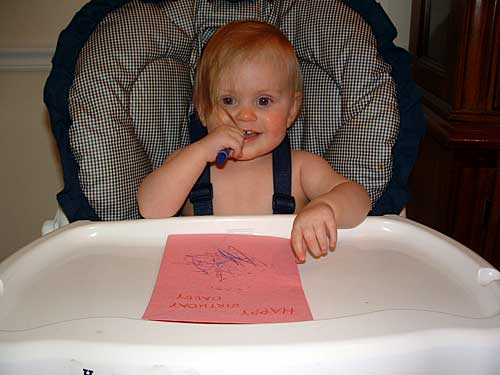 Yesterday, Taylor & I went to Walmart and got the stuff to make her daddy a birthday card. Yes, I made two imprints of her left hand. I'll just tell you that I don't recommend doing this without at least one other adult...at least if it's your first time ever doing it. It was fun :) Oh yeah, some of the crayon scribbling is hers, some is mine trying to show her how to do it. As you can see, she was more interested in eating the crayon (they're non-toxic & I didn't let her!)
