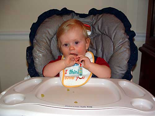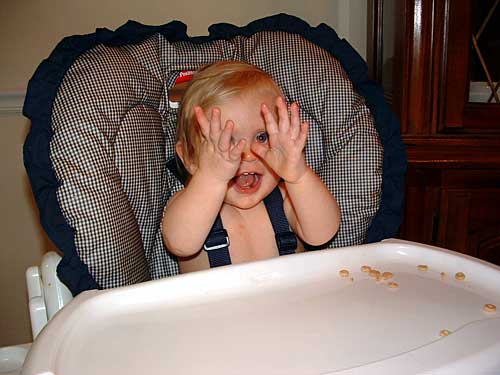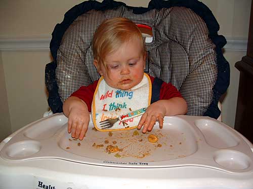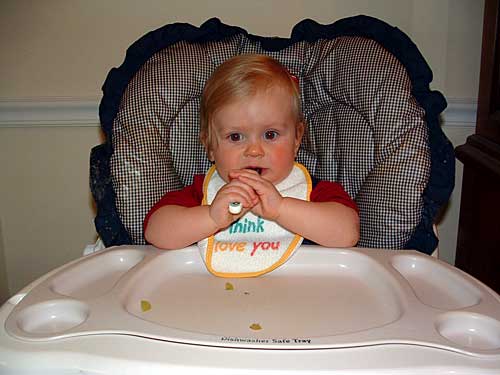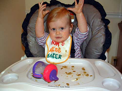 And these are from today. The last day or so has been trying during mealtime. She's asserting her independence and deciding she doesn't like what mommy's been fixing her. At lunch today she ate as if we'd been starving her. 4 oz Gerber Pasta Pickups, 4.5 oz green beans, yogurt, slice of bread and 5 oz of milk. The bib says Mom's Mess Maker and considering the mess on her and the tray, I felt it was too appropriate and too priceless to pass up.