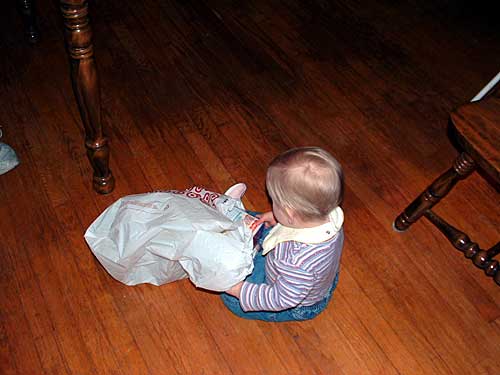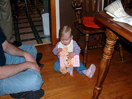 Taylor received her birthday card from her Georgia grandparents today, and here are special pictures for them. The amazing part - she held onto the card, crawling with it all over the room, and never once tried to eat it. Does that mean she likes the card?