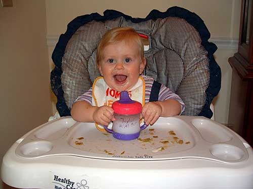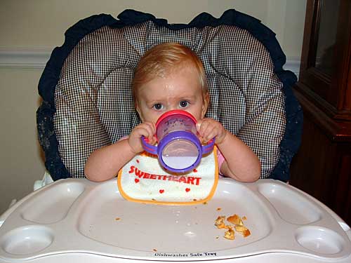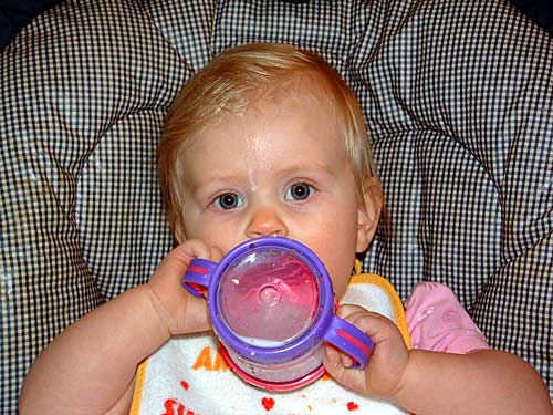I decided to finally introduce her to milk. We also got serious with including the sippy cup at each meal and she's now doing very well with it. Up until this picture, she had only had water in her cup. She likes to hold it up over her head and play peek-a-boo around it. In the process, she had a line of milk from her forehead to her chin.