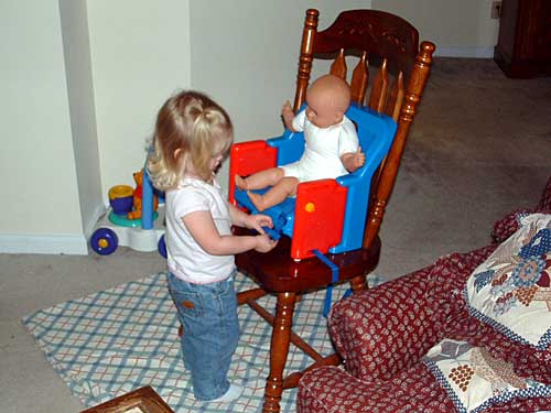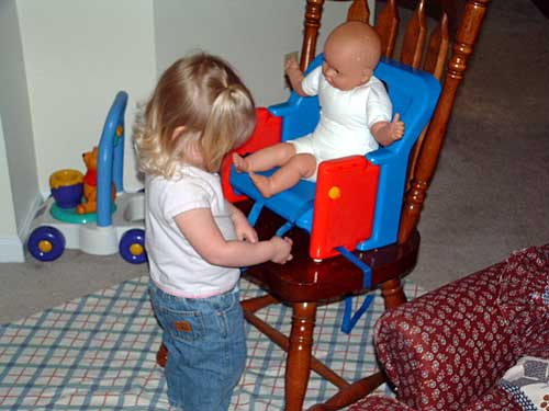 Taylor is taking more and more interest in her baby dolls. They get "stinky" and get diaper changes. They have to go to bed. They get spanked. And they eat, too. Here, this still-unnamed little girl is buckled into her high chair. Taylor is very good with the buckles.
