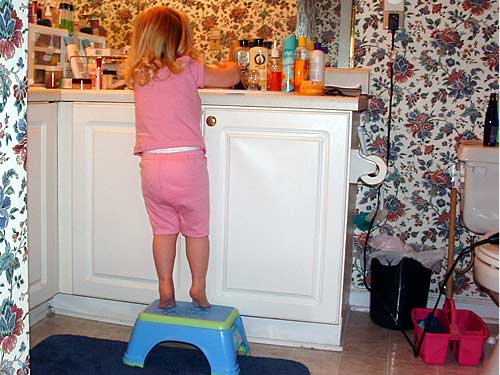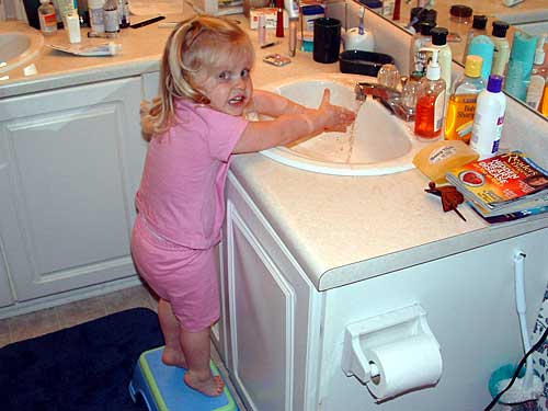 Taylor loves to wash hands. Soap and all. Here we are, just home from school, stretching up on her tip toes so she can reach the water.
