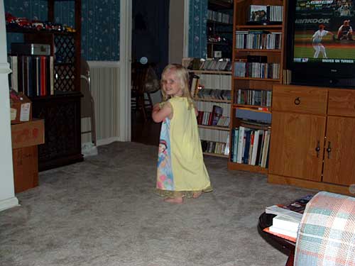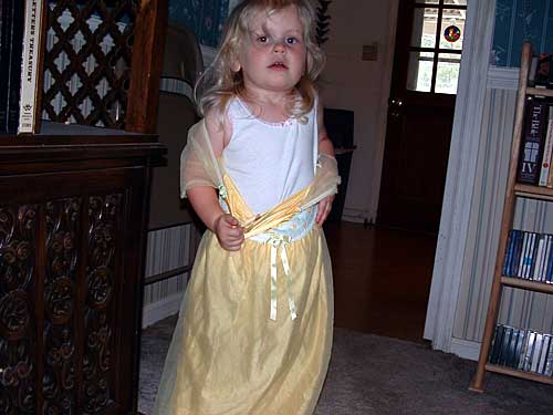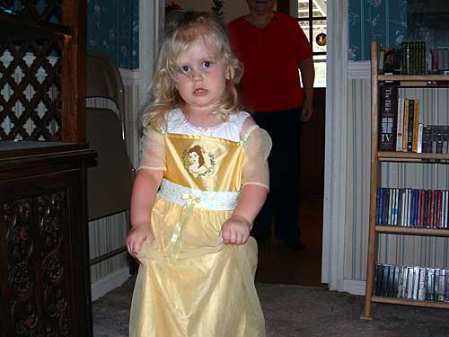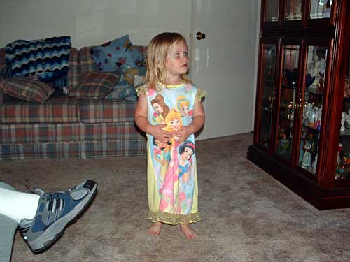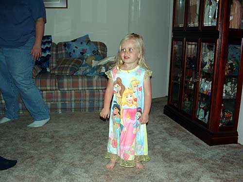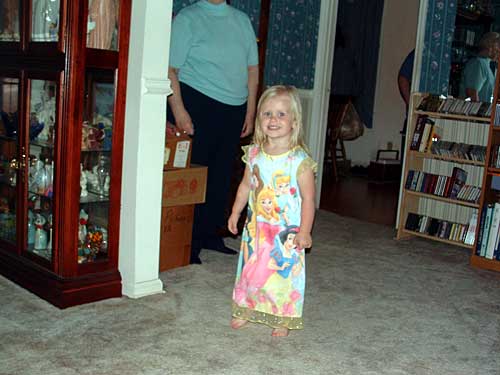 This is Taylor's new Princess nightgown. Mimi bought it not because of the princesses, but rather because it was yellow. Taylor loves yellow.