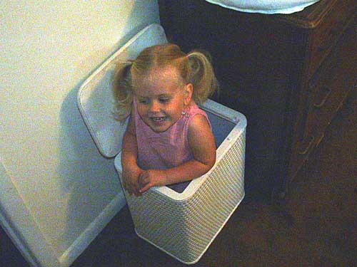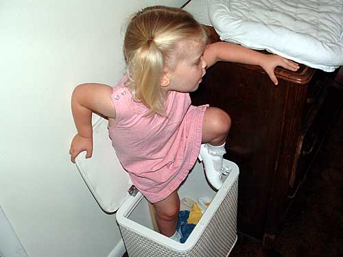 Taylor surprised us last week by demonstrating her prowess in climbing into her dirty clothes hamper. The first picture is pretty grainy because I was in a hurry to snap it and didn't give the flash time to charge. The original was pretty dark, so here you go thanks to the magic of photo editing.