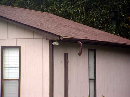 Close-up of neighbor's house. The wind alone - not a tree or anything falling that I could see - ripped the power service line off of the house, and took out the gutter in the process.
