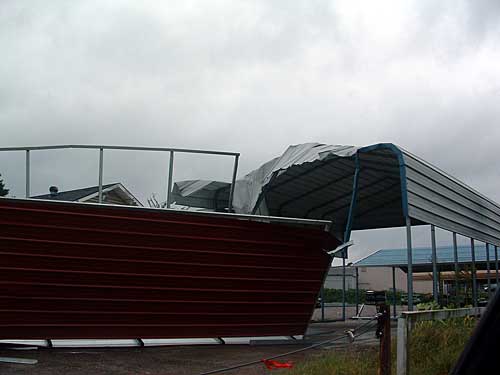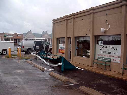 An aluminum shed store did not fare well. I couldn't get a better picture thanks to a lack of places to pull off, but this place was hit pretty hard as you might imagine.