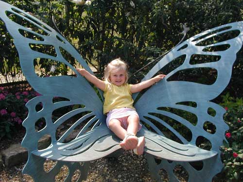 During our last trip to Huntsville, we went to the Botanical Gardens there, and walked through the butterfly house exhibit. We found this park bench and after some coercion, got Taylor to pose for this picture.