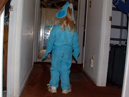 After dressing her in a summery dress on an unseasonably cool day, I decided to get her a couple pairs of pants, size 4T (keep in mind that I now buy her shirts & dresses in the girl's dept!). Apparently, her bottom half hasn't caught up with her top half. The pants are baggy and she was walking around this morning and pulling them up. I decided to take a chance. I grabbed a pair of her 3T jeans from last year - they fit! So she's a 3T bottom (for probably another month or 2) and a small-medium top. I guess this is part of the payback my mother told me about... (For Ariel: Don't worry, we'll still be passing on the vast majority of Taylor's 3T stuff. We'll keep 2-3 pairs of pants, but the rest goes to you! And there's 3 or 4 that are complete outfits and I don't believe in breaking up outfits. :) ).