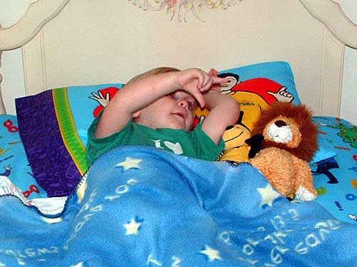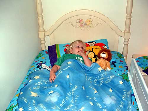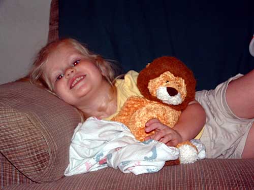 Taylor, in her Wiggles sheets, with her lion, her bee and her very cozy stars blanket.