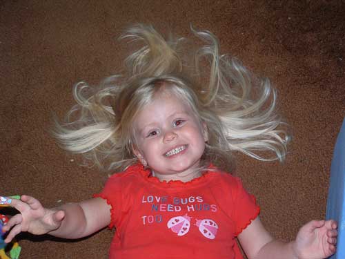 One aside on the toys.. they were blocks and cars. She's line up some of the blocks and drive the cars over them, sometimes jumping. We asked, "What do you say when the cars jump?" She said, "Yee ha!" Yep, she's been watching too many Dukes of Hazzard reruns with her daddy! LOL