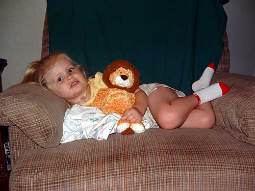 The one with Taylor in bed with a bee and Lion was taken shortly after our trip to GA for Mimi & Papa's anniversary. The bee was a new addition and earned a coveted spot next to Lion. Please take note of Lion's mane in that first picture. Now scroll down to the pictures of Taylor in daddy's chair with Lion. Notice anything odd about his mane? Well, Taylor got sick one night and Lion was a casualty - he got washed and dried. Apparently we should've air-dried him as he now sports a very nifty afro. :)