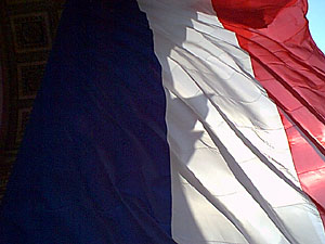 French flag suspended from the arc - they had just had a big celebration and ceremony