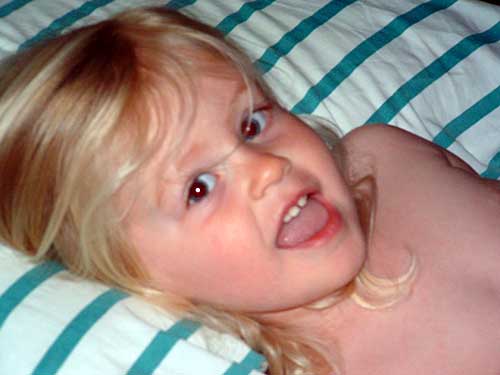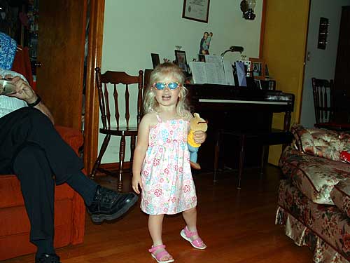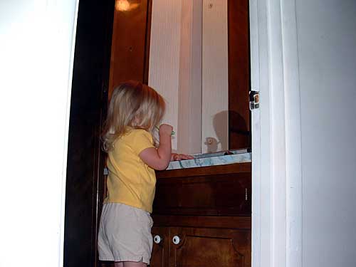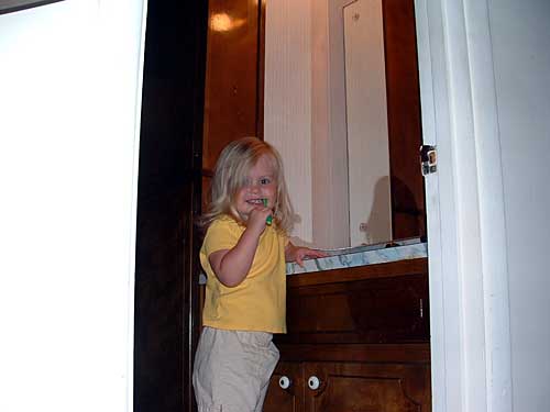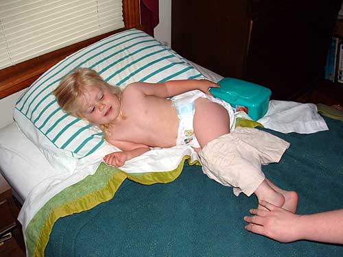 This is where she tried to put her own shorts on (I do it, mama!). She managed to get both legs in together before asking for help. Of course, we had to take a picture first. (Is this why she revolted against the camera in Georgia? Hmm…)