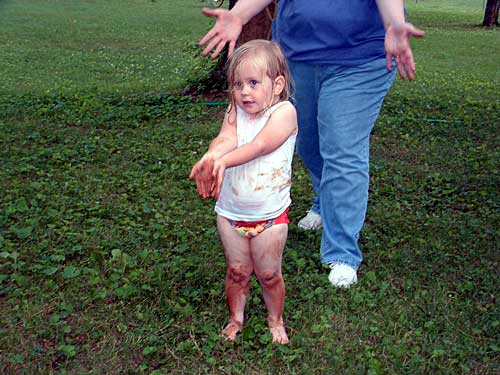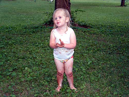 After playing in the pool and sprinkler, Taylor and Ariel decided to play in the dirt pile. Taylor apparently played a little harder in it than her cousin did.