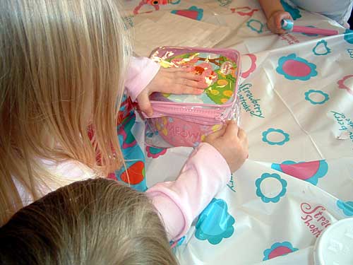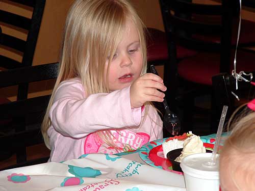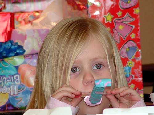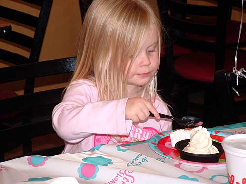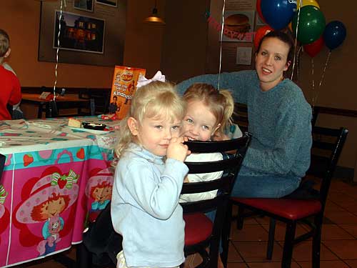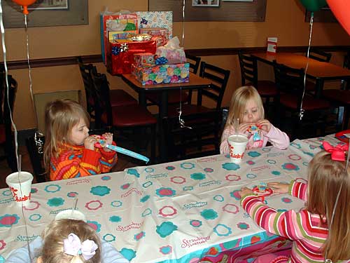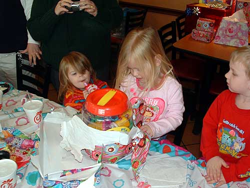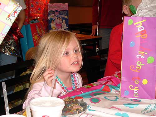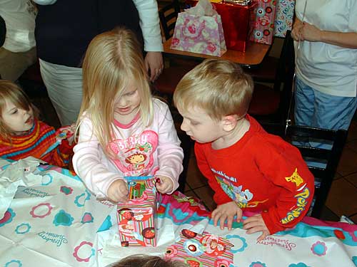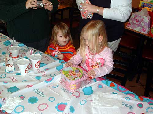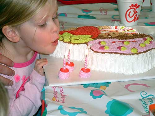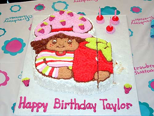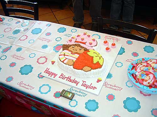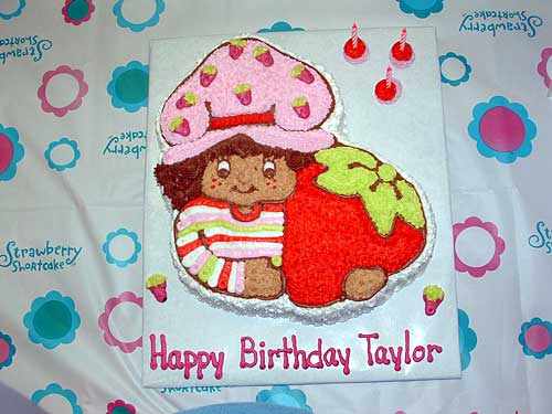 Beautiful birthday cake. Elizabeth will have to share those details. Forget the megastores – we have a favorite cake bakery person here now. Elizabeth’s details: I was lamenting to a coworker about how lame the Strawberry Shortcake design was at the local grocery store bakeries and had decided to go with a modified Tweety Bird – as in, paint it like this but leave off the Tweety Bird stuff and add a couple more butterflies, I’ll buy a Strawberry Shortcake candle! She told me about the lady she uses and even called her for me – on the Thursday afternoon before the party. “Yes, I can do that” and she named a surprisingly low price. The reason I wasn’t completely worried about it is that this coworker is notoriously, perfectionisticly picky (used to be a photographer… at a fund raiser shoot of her children, she was telling the photographer what to do so much that he finally said, “Would you like to do it?” To which she said she would and she did!) The cake lady did a great job and we’ll definitely use her again!