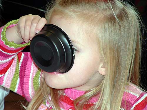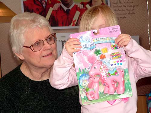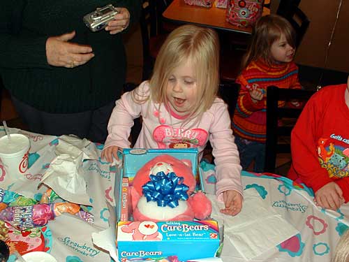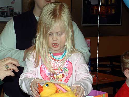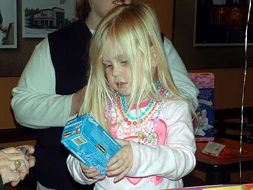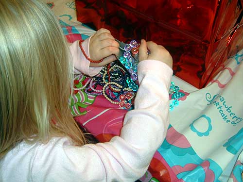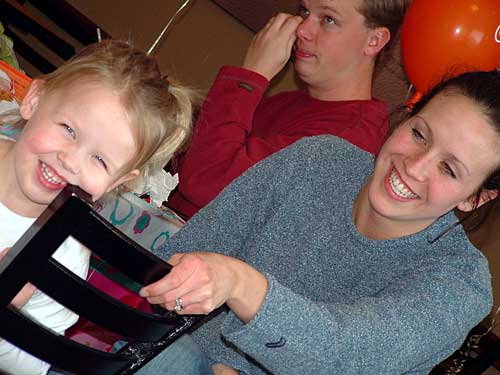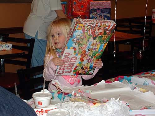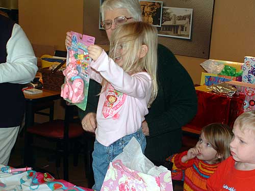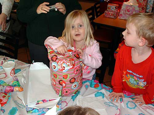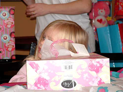 Trying to get Taylor to show off her presents for the camera, and all she does is hide behind them.